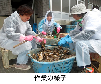 参加選手たちは作業台に積まれた牡蠣を掃除していきました。最初は力の加減やどこまで掃除すればいいのかなど、漁師の方に教えて頂きながら作業していましたが、コツを掴むとペースがあがり、次々と綺麗にしていきました。