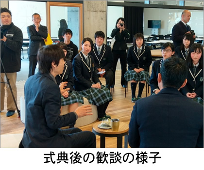 式典後は、このスペースにオープンするカフェスペースの生徒たちが作ったケーキを試食しながら歓談し、生徒から「目標に向かって努力し続けられる原動力は何ですか」、「福島の印象はどうですか」といった質問が矢継ぎ早に守田選手に投げかけられていた。