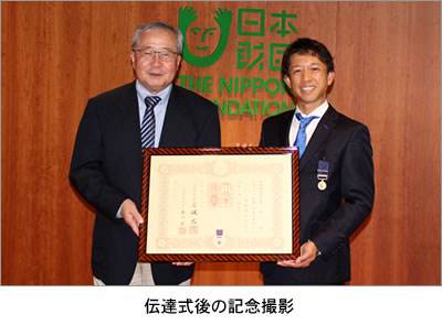 9月30日(火)に、褒章伝達式が公益財団法人日本財団ビルにおいて開催され、尾形武寿日本財団会長より毒島選手に紺綬褒章が授与されました。