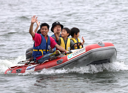 ボートレーサーは「少年少女ゴムボート大会」で操縦者として参加。来場者約700名が水上体験を楽しませました。