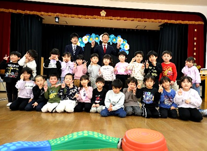 当日は、副支部長の小林一樹選手が代表して出席し、贈呈式では園児の皆さんに直接玩具を手渡しいたしました。贈呈式の後には園児と一緒に遊んで交流を深める時間も設けられ、園内には子どもたちの明るい笑顔と活気があふれておりました。園長先生をはじめ園児の皆さまからも「とても楽しかった」「また一緒に遊んでほしい」といった喜びの声が寄せられ、今回の活動が多くの方々に喜ばれたことを実感いたしました。